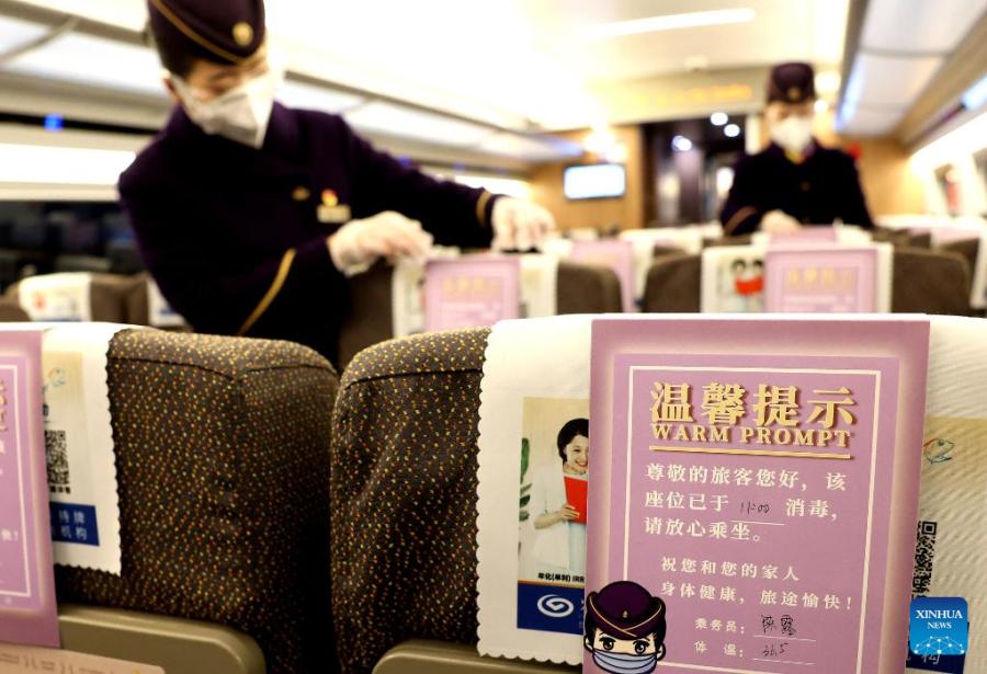 Crew members place disinfection notices on train G1724 in east China's Shanghai, Jan. 16, 2022.(Xinhua/Chen Fei)