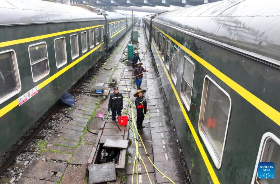 Staff members clean train carriages at a service garage in Hengyang, central China's Hunan Province, Jan. 16, 2022. The Spring Festival travel rush, China's largest annual travel rush, will last from Jan. 17 to Feb. 25 this year. During the 40-day travel season, also known as chunyun, many Chinese people will travel to meet their families for the Chinese Lunar New Year, or Spring Festival, which will fall on Feb. 1, 2022. (Photo by Cao Zhengping/Xinhua)