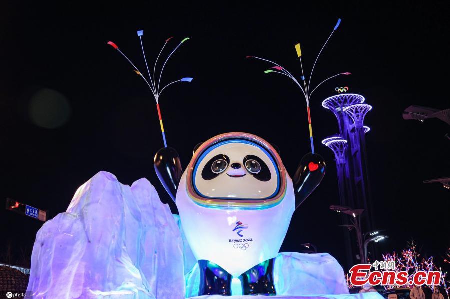 Photo shows people taking photos with "Bing Dwen Dwen", mascot of the Beijing 2022 Winter Olympic and Paralympic Games, in Beijing, capital of China, Jan. 16, 2022. (Photo: China News Service/Yi Haifei)