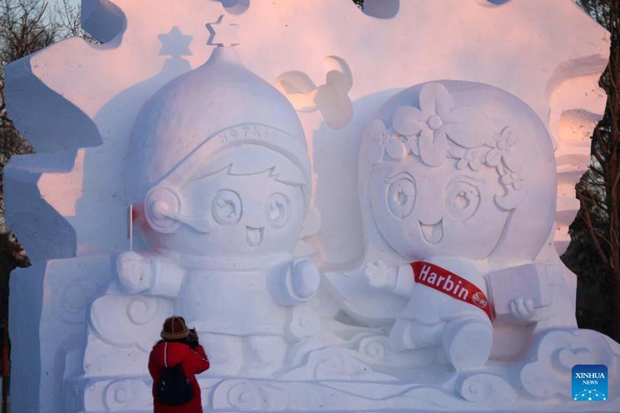 A tourist visits the Sun Island International Snow Sculpture Art Exposition in Harbin, northeast China's Heilongjiang Province, Jan. 14, 2022. (Xinhua/Wang Jianwei)