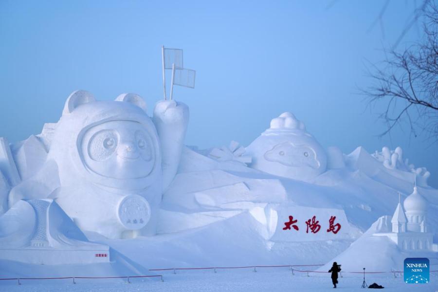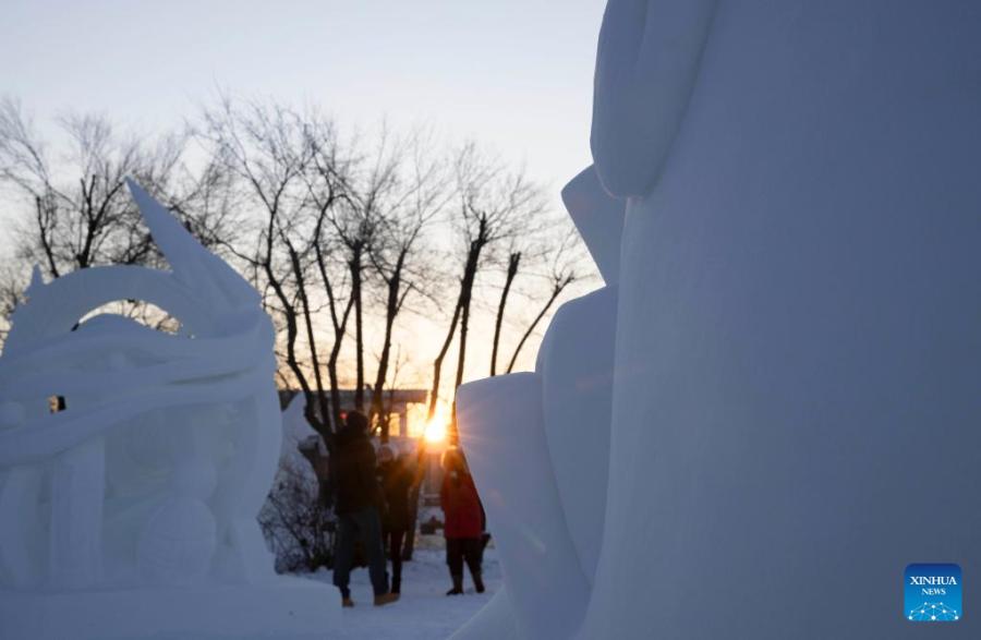 Tourists visit the Sun Island International Snow Sculpture Art Exposition in Harbin, northeast China's Heilongjiang Province, Jan. 14, 2022. (Xinhua/Zhang Tao)