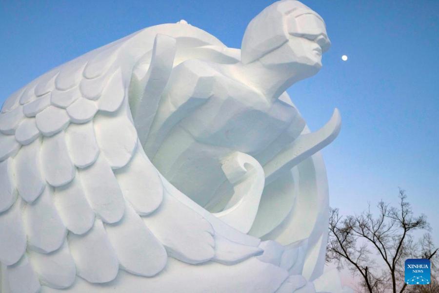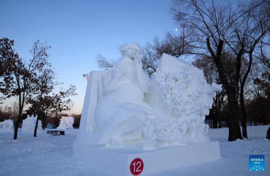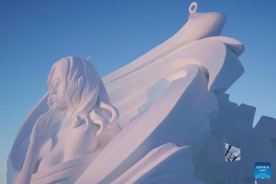 Photo taken on Jan. 14, 2022 shows a snow sculpture during the 28th Harbin snow sculpture competition at the Harbin Sun Island International Snow Sculpture Art Exposition in Harbin, northeast China's Heilongjiang Province.(Xinhua/Wang Jianwei)