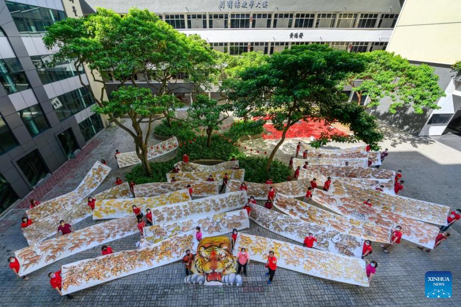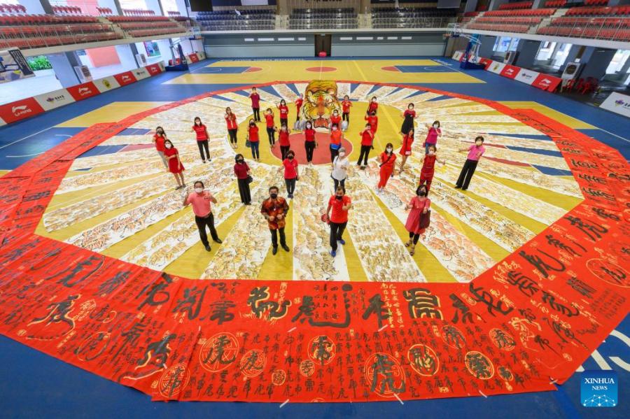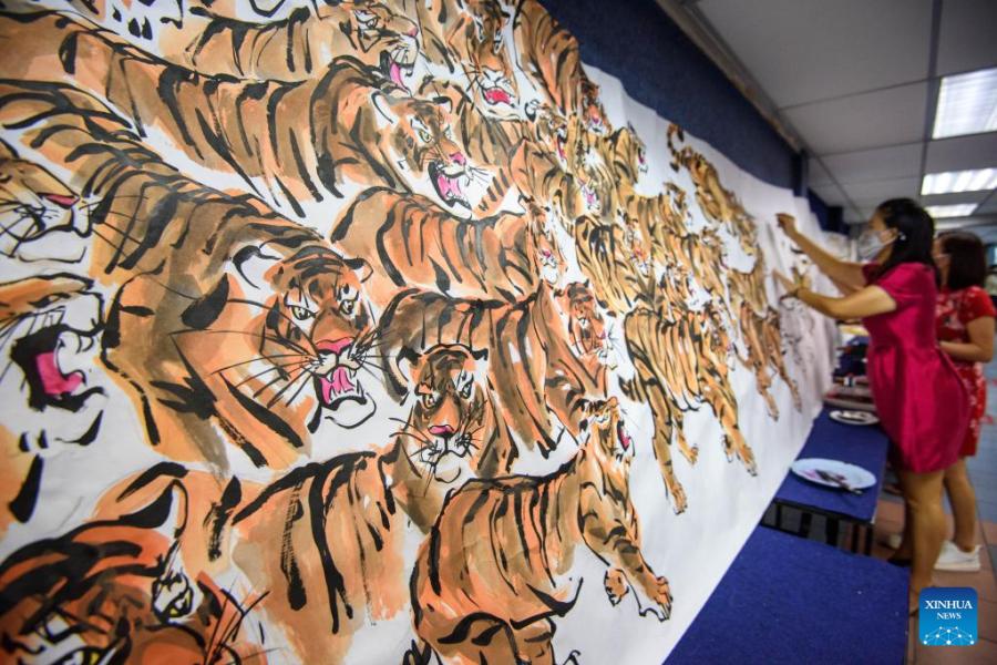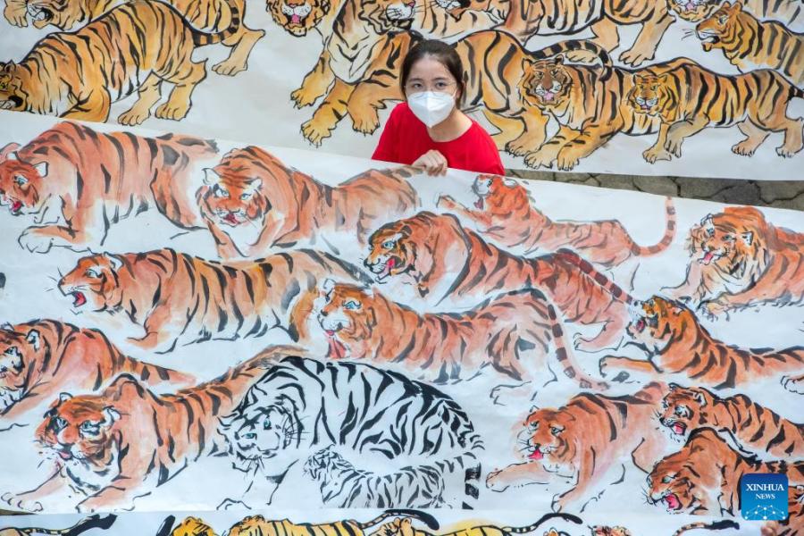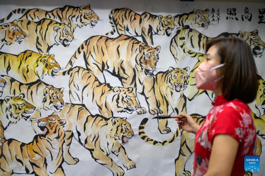 A painter creates tiger paintings in Klang of Selangor states, Malaysia, Dec. 30, 2021. An art project composed of 2,022 tiger paintings and 2,022 Chinese characters of Hu, meaning tiger, by local artists and enthusiasts was displayed here on Jan. 16, 2022 to welcome the upcoming Chinese zodiac Year of the Tiger. (Photo by Chong Voon Chung/Xinhua)