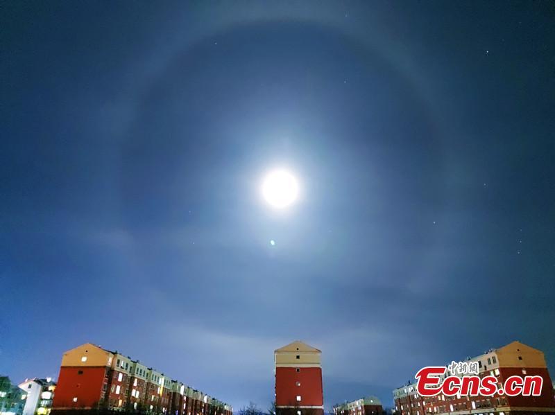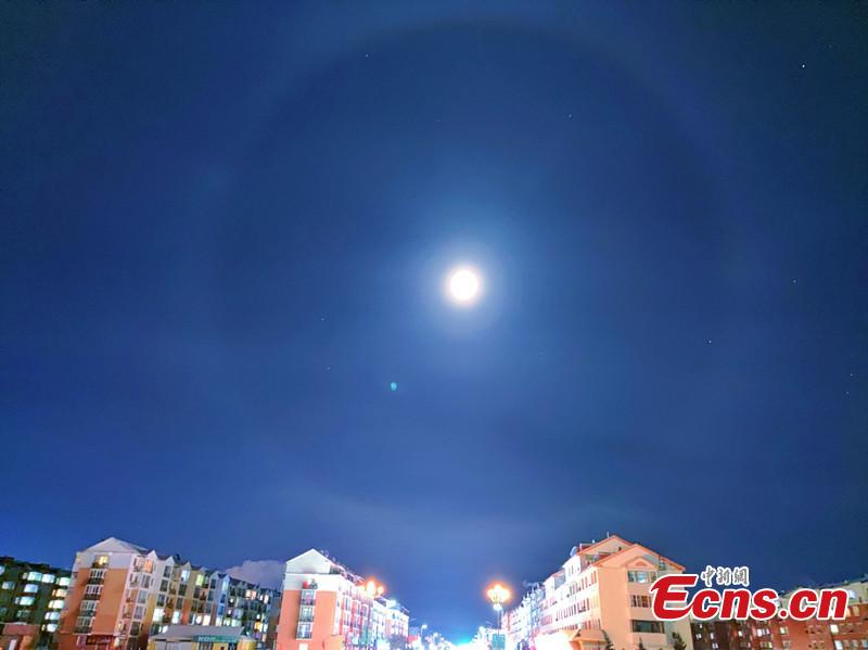 Lunar halo appears over Genhe city, China's pole of cold, in Inner Mongolia Autonomous Region,Jan.16, 2022. (Photo:China News Service/Liu Liping)