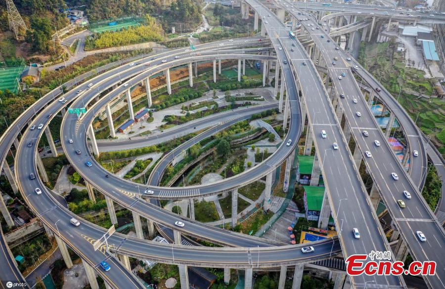 Aerial photo taken on Jan. 17, 2022 shows the Qianchun Overpass in Guiyang, southwest China's Guizhou Province. The overpass has a structure of 5 levels and 11 lanes. Located in a canyon in Guiyang, the overpass has a vertical drop up to 55 meters. It is dubbed "the most complicated overpass in Guiyang" by netizens. (Photo/ICphoto)