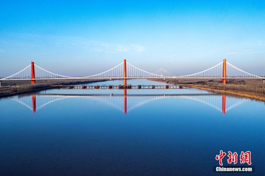 File photo taken on Dec. 1, 2021, shows the Fenghuang Road Yellow River Bridge, the world's longest-span three-tower self-anchored suspension bridge, in Jinan, east China's Shandong Province. The 6,683-meter-long self-anchored suspension bridge opened to traffic on Tuesday. (Photo provided to China News Service)