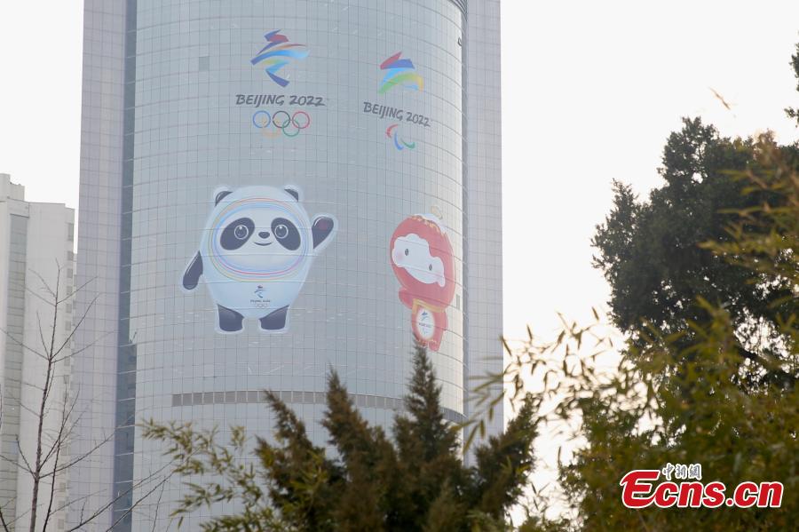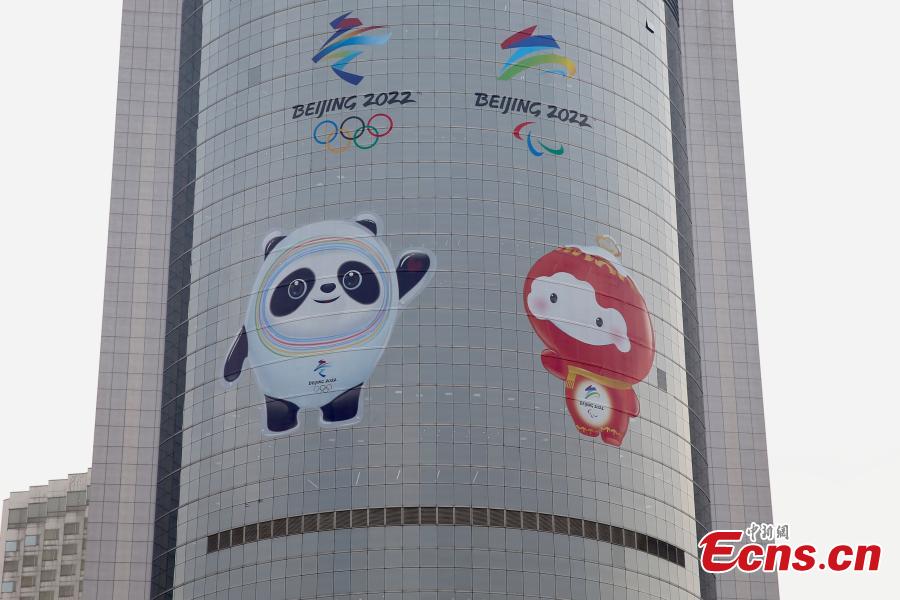 Photo shows the images of "Bing Dwen Dwen" and "Shuey Rhon Rhon," mascots of the Beijing 2022 Winter Olympic Games and Paralympic Games, on a building in Beijing, Jan. 19, 2022. Despite the grave challenges posed by the ongoing COVID-19 pandemic, Beijing is to host the Beijing 2022 Winter Olympics and Paralympics as planned. (Photo: China News Service/Yi Haifei)
