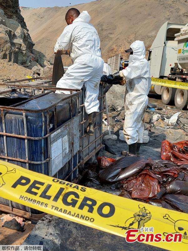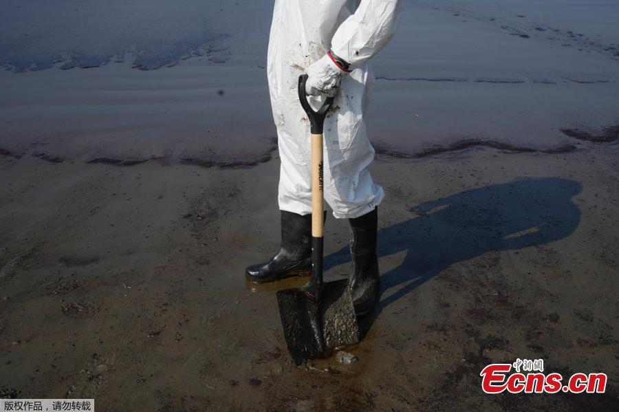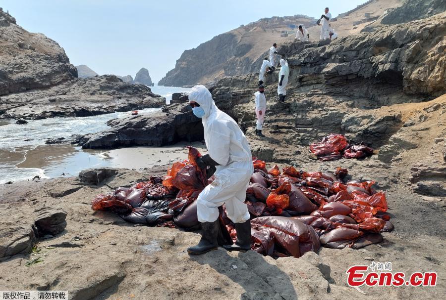 Cleaning crews work to remove oil from a beach in the Peruvian province of Callao, Jan. 19, 2022 after a spill which occurred during the offloading process of the Italian-flagged tanker "Mare Doricum" at La Pampilla refinery caused by the abnormal waves recorded after the volcanic eruption in Tonga. Peruvian authorities sealed off three beaches on Monday after 6,000 barrels of oil were spilled and demanded compensation Wednesday from Spanish energy giant Repsol over the oil spill. (Photo/Agencies)