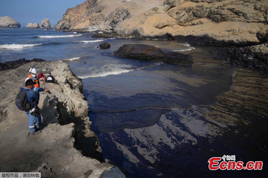 Workers look at the oil in the waters of Cavero Beach in Ventanilla, Callao, Peru, Jan. 18, 2022. (Photo/Agencies)
