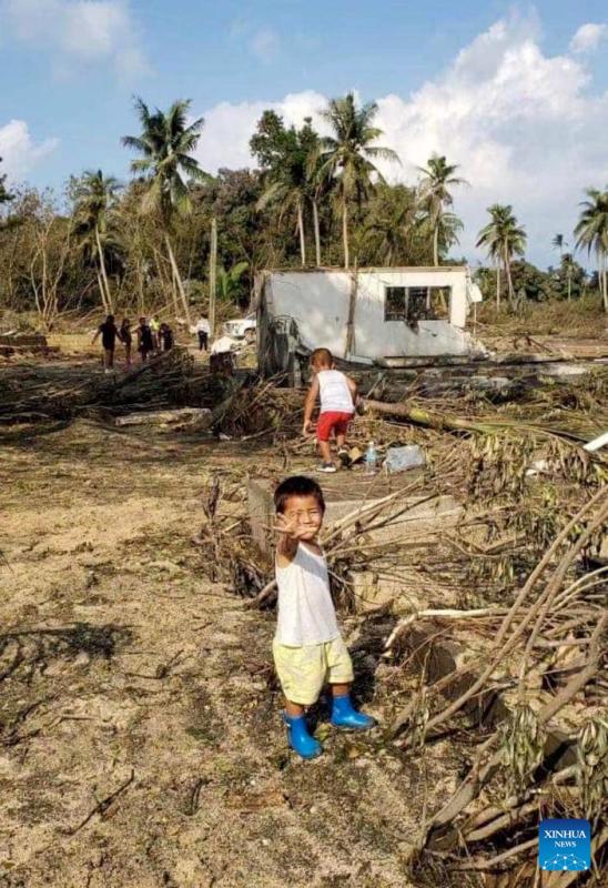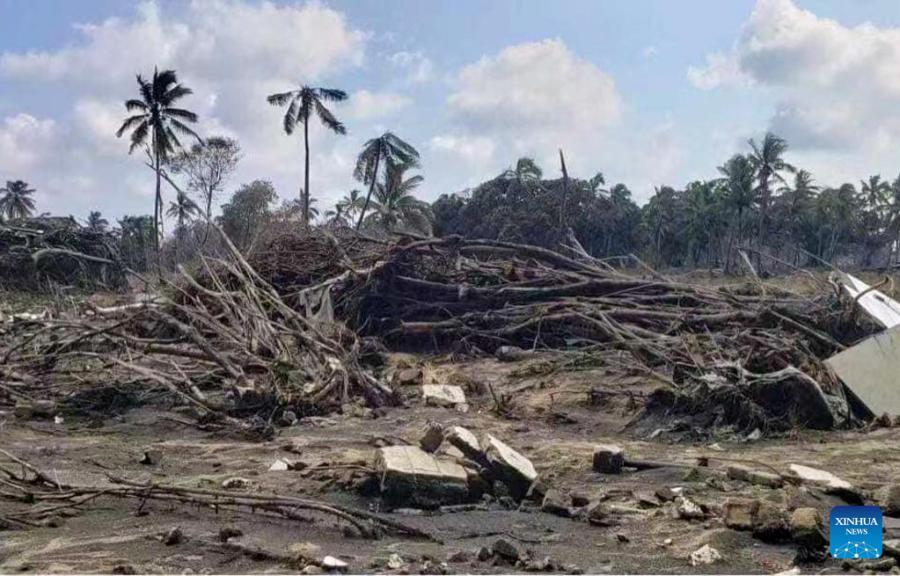 Photo taken on Jan. 19, 2022 shows a beach resort hit by tsunami on the outskirts of Nuku'alofa, capital of Tonga. On Jan. 14-15, the Hunga Tonga-Hunga Ha'apai volcano in Tonga erupted violently, triggering tsunami in Tonga. (Ha'atafu Beach Resort/Handout via Xinhua)