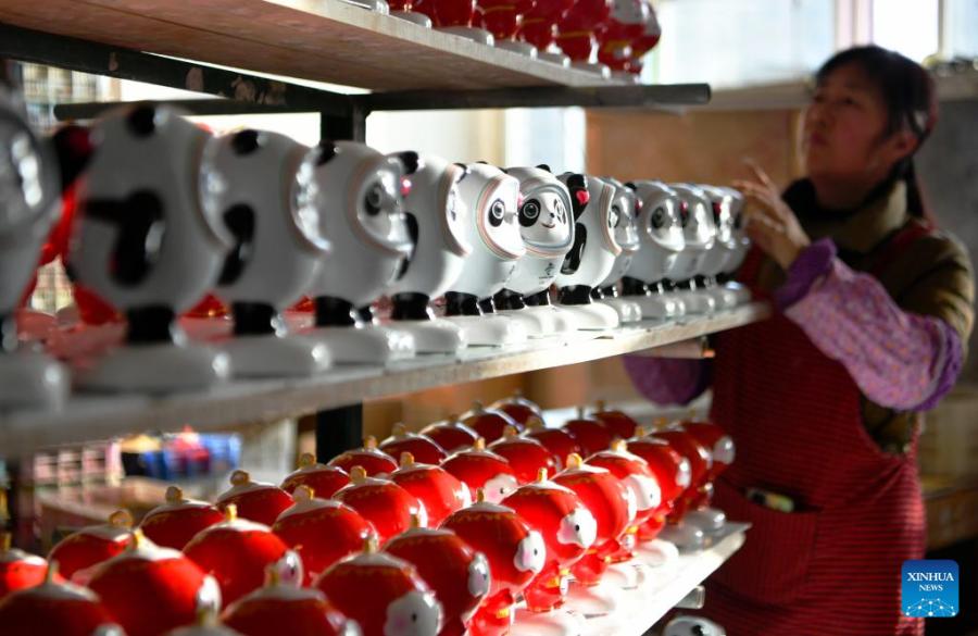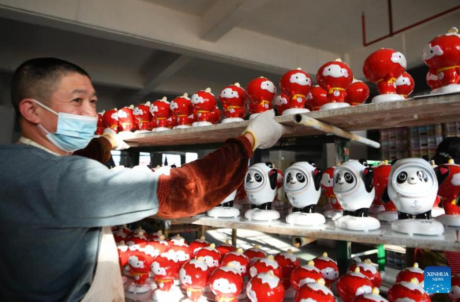 A worker colors porcelain figures of Beijing 2022 mascots at a porcelain factory in Dehua County of Quanzhou, southeast China's Fujian Province, Jan. 19, 2022. (Xinhua/Wei Peiquan)