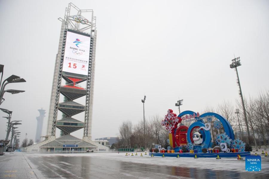 Photo taken on Jan. 20, 2022 shows the count-down board of the Beijing 2022 Olympic Winter Games amid snowfall in Beijing, capital of China. (Xinhua/Chen Zhonghao)