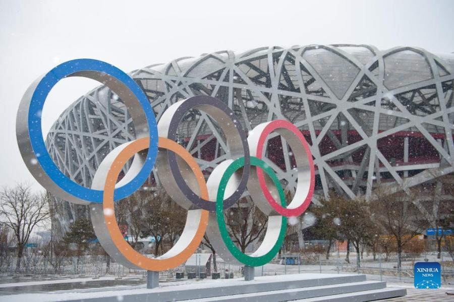 Photo taken on Jan. 20, 2022 shows the Olympic rings and the National Stadium amid snowfall in Beijing, capital of China. (Xinhua/Chen Zhonghao)