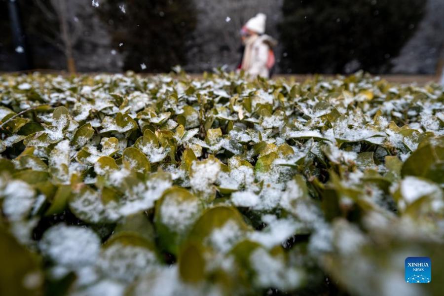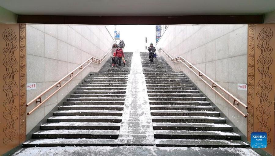 Photo taken on Jan. 20, 2022 with a mobile phone shows citizens walking amid snowfall in Beijing, capital of China. (Xinhua/Ding Hongfa)