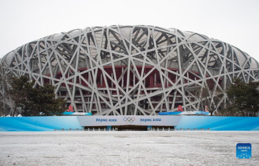 Photo taken on Jan. 20, 2022 shows the National Stadium amid snowfall in Beijing, capital of China. (Xinhua/Chen Zhonghao)