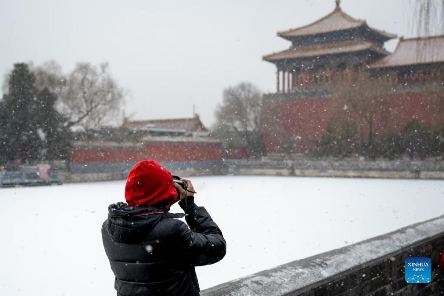 A tourist takes pictures of the snow scenery outside the Palace Museum in Beijing, capital of China, Jan. 20, 2022. (Xinhua/Liu Jinhai)