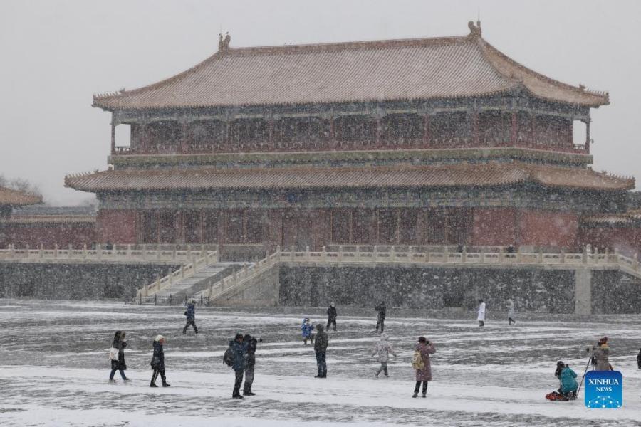 Tourist walk outside the Palace Museum amid snowfall in Beijing, capital of China, Jan. 20, 2022. (Xinhua/Liu Jinhai)