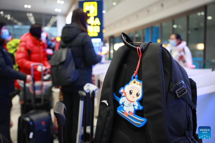 A passenger accepts security check to get in a train of the Beijing-Zhangjiakou high-speed railway line, in Beijing, capital of China, Jan. 21, 2022. The service of this railway line for Beijing 2022 started from Jan. 21, 2022. (Xinhua/Liu Xu)