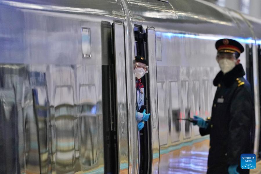 Staff members are seen on a train of the Beijing-Zhangjiakou high-speed railway line, in Beijing, capital of China, Jan. 21, 2022. The service of this railway line for Beijing 2022 started from Jan. 21, 2022. (Xinhua/Liu Xu)