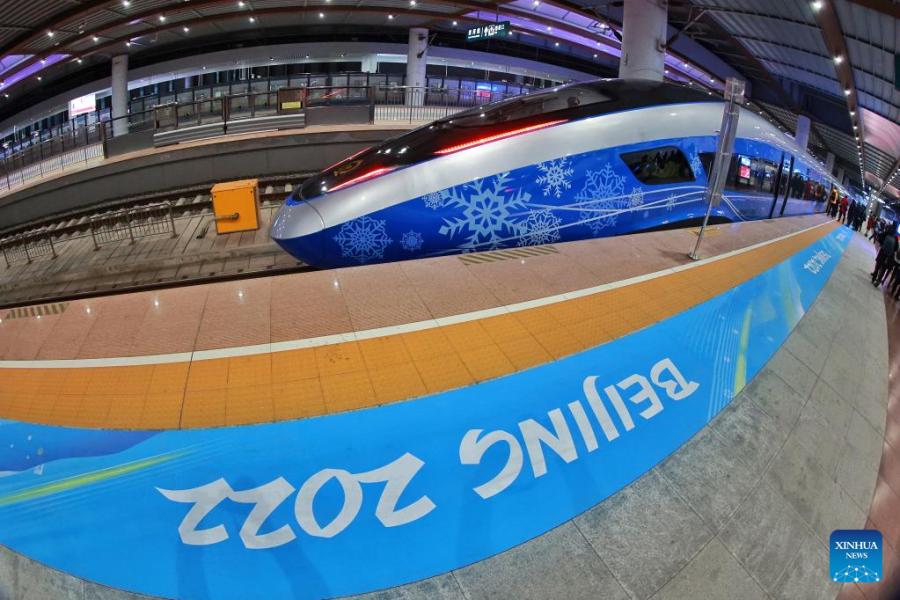 Photo taken on Jan. 21, 2022 shows a train of the Beijing-Zhangjiakou high-speed railway line in Beijing, capital of China. The service of this railway line for Beijing 2022 started from Jan. 21, 2022. (Xinhua/Liu Xu)