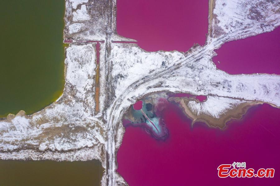 The colorful Salt Lake in Yuncheng city, North China's Shanxi province is beautifully decorated by snow on Jan.23, 2022 as the temperature plummets. (Photo/VCG)