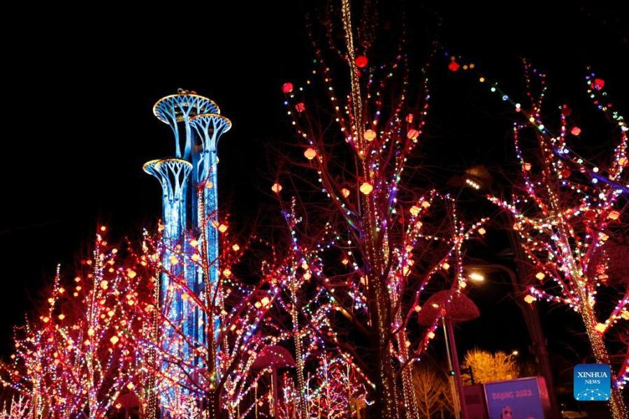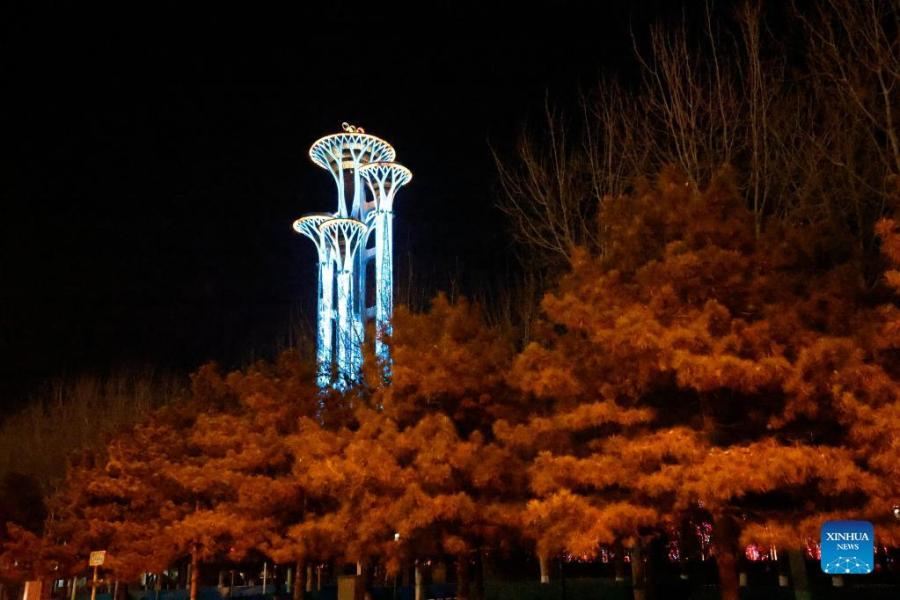 Photo taken with a mobile phone shows the illuminated Beijing Olympic Tower in Beijing, capital of China, Jan. 27, 2022. With one week to go before the opening of the 2022 Olympic Winter Games, Beijing will become the first city to host both summer and winter editions of the Olympic Games. (Xinhua/Ding Xu)