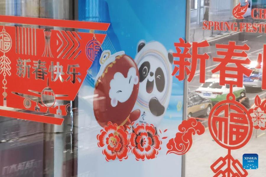 Photo taken with a mobile phone shows a mascot's poster of the Beijing 2022 Olympic Winter Games at Daxing International Airport in Beijing, capital of China, Jan. 20, 2022. With one week to go before the opening of the 2022 Olympic Winter Games, Beijing will become the first city to host both summer and winter editions of the Olympic Games. (Xinhua/Zhang Chuanqi)