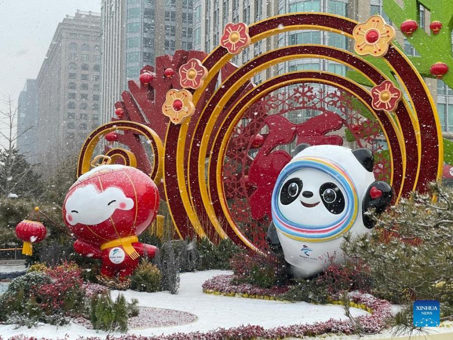 Photo taken with a mobile phone shows street decorations for the Beijing 2022 Winter Olympics in Beijing, capital of China, Jan. 22, 2022. With one week to go before the opening of the 2022 Olympic Winter Games, Beijing will become the first city to host both summer and winter editions of the Olympic Games. (Xinhua/Ding Hongfa)