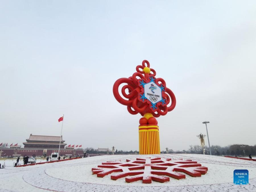 Photo taken with a mobile phone shows a giant Chinese knot with emblem of the Beijing 2022 Olympic Winter Games on Tian'anmen Square in Beijing, capital of China, Jan. 20, 2022. With one week to go before the opening of the 2022 Olympic Winter Games, Beijing will become the first city to host both summer and winter editions of the Olympic Games. (Xinhua/Chen Yehua)