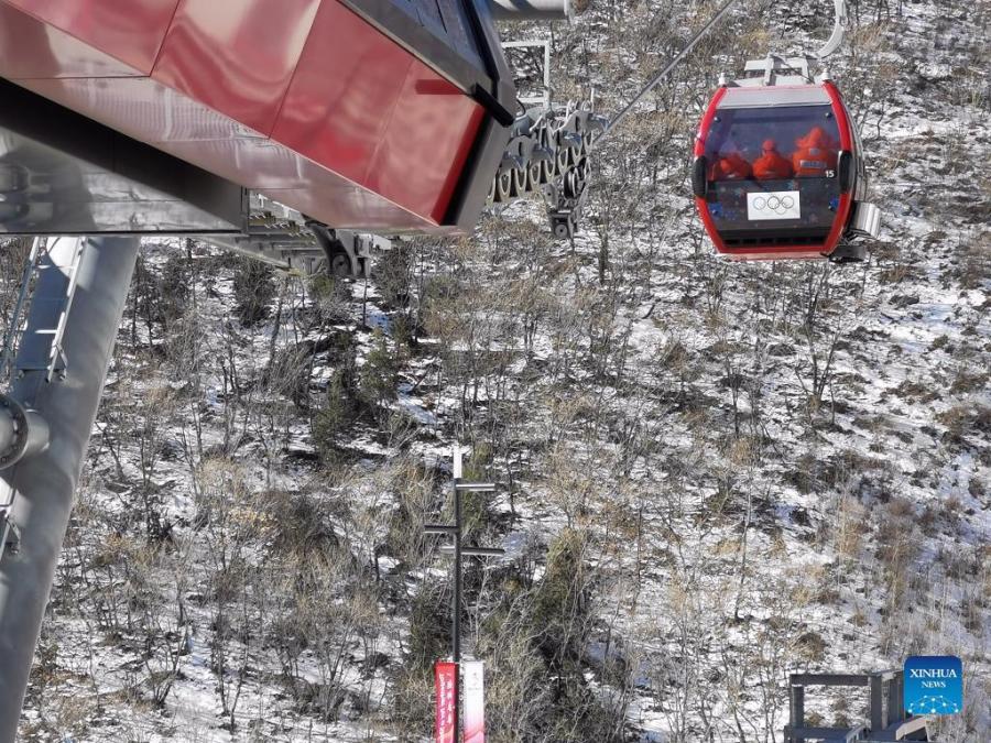 Photo taken with a mobile phone shows people riding a cable car at the Yanqing competition zone for the Beijing 2022 Winter Olympics in Yanqing District of Beijing, capital of China, Jan. 28, 2022. With one week to go before the opening of the 2022 Olympic Winter Games, Beijing will become the first city to host both summer and winter editions of the Olympic Games. (Xinhua/Zhang Chenlin)