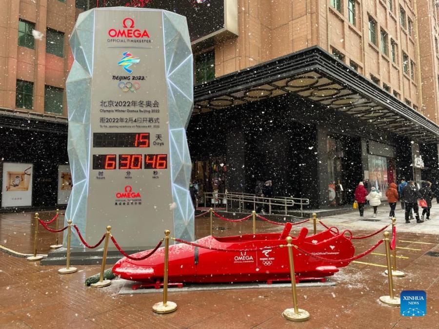 Photo taken with a mobile phone shows a countdown timer for the opening ceremony of the Beijing 2022 Winter Olympics in Beijing, capital of China, Jan. 20, 2022. With one week to go before the opening of the 2022 Olympic Winter Games, Beijing will become the first city to host both summer and winter editions of the Olympic Games. (Xinhua/Chu Jiayin)