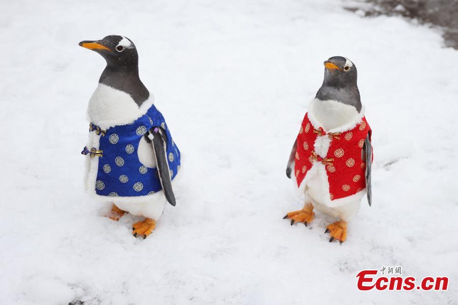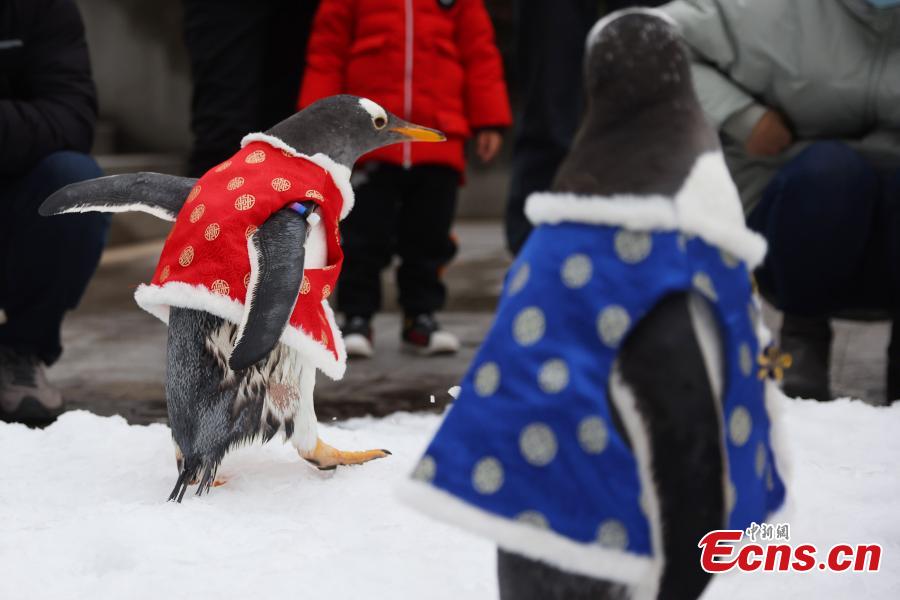 Four-year-old Gentoo penguins "Xiaoxi" and "Xiaole", dressed in Chinese New Year costumes, skate on the ice at the square of Nanjing Marine World in Nanjing, east China's Jiangsu Province, Jan. 29, 2022. (Photo: China News Service/Yang Bo)