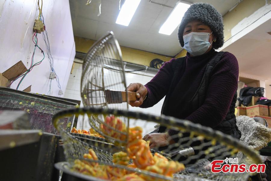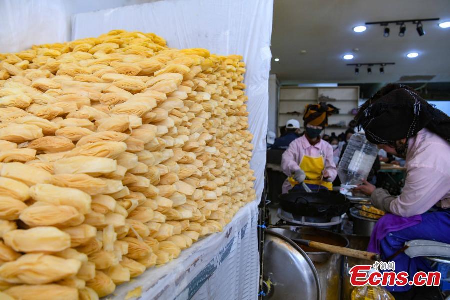 Shop assistants are making "Kasai," a traditional Tibetan food, in Lhasa, capital of Southwest China's Tibet Autonomous Region, Jan. 29, 2022. (Photo/China News Service)
