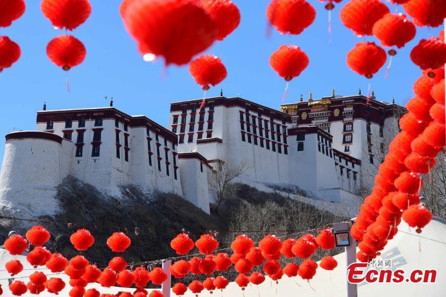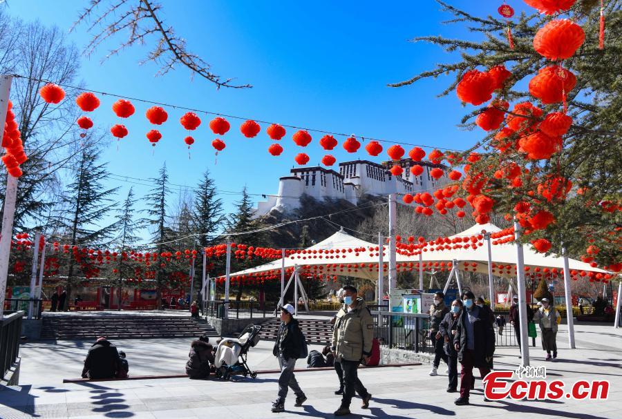 Red lanterns are seen at Zongjiaolukang Park in Lhasa, capital of southwest China's Tibet autonomous region, Jan. 29, 2022. (Photo/China News Service)