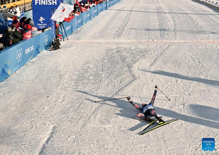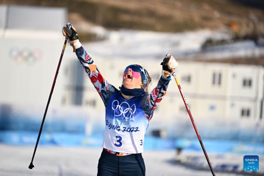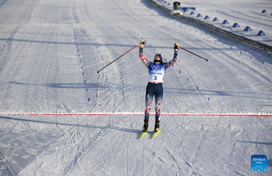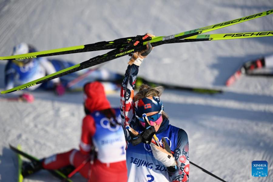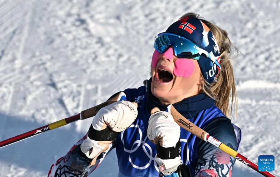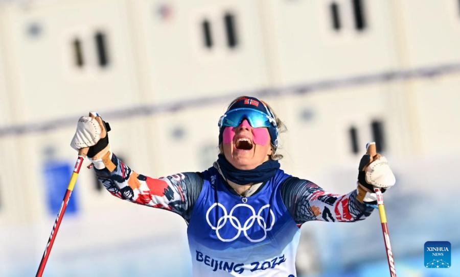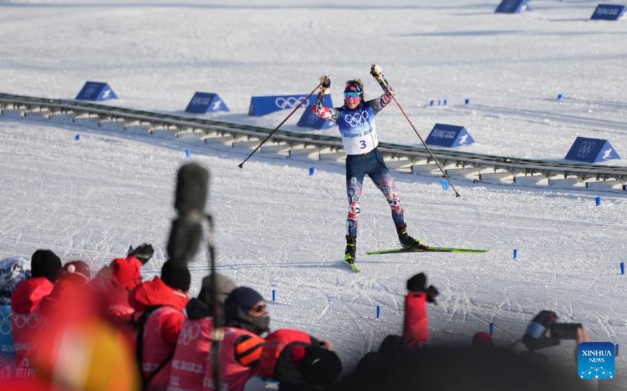 Norway's Therese Johaug celebrates after winning the Cross-Country Skiing Women's 7.5km + 7.5km Skiathlon at National Cross-Country Skiing Centre in Zhangjiakou, north China's Hebei Province, Feb. 5, 2022. (Xinhua/Xiao Yijiu)