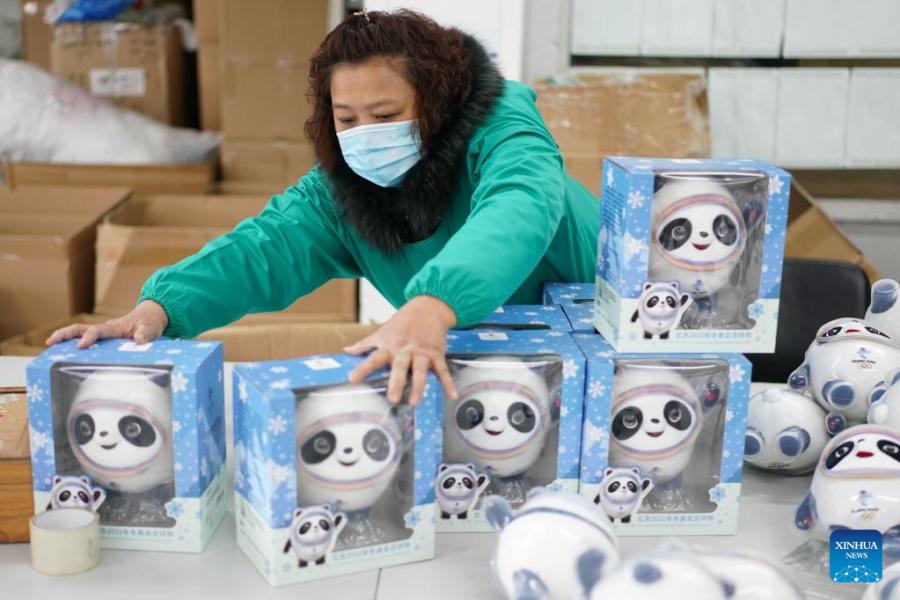 Workers produce Bing Dwen Dwen merchandise at a licensed manufacturer in Qidong, east China's Jiangsu Province, Feb. 8, 2022. Bing Dwen Dwen, the mascot for the Beijing 2022 Olympic Winter Games, has recently become a smash hit. A licensed manufacturer in Qidong has increased production of Bing Dwen Dwen merchandise to ensure adequate supply for the market. (Xinhua/Ji Chunpeng)