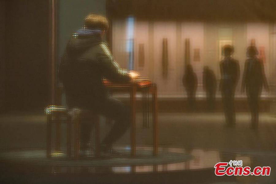 A visitor plays a duplicated traditional Chinese musical instrument at the China National Arts and Crafts Museum and China Intangible Cultural Heritage Museum in Beijing, Feb. 8, 2022. (Photo: China News Service/Hou Yu)