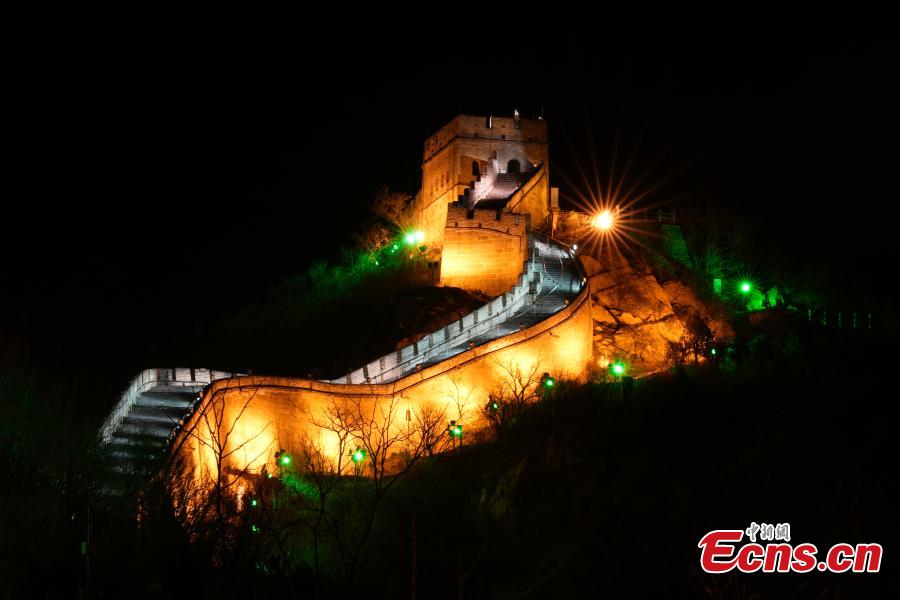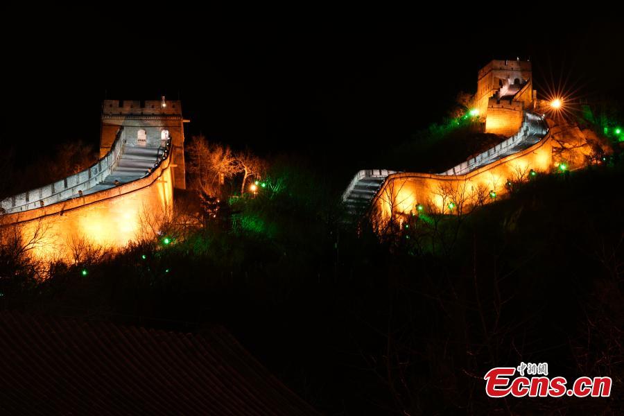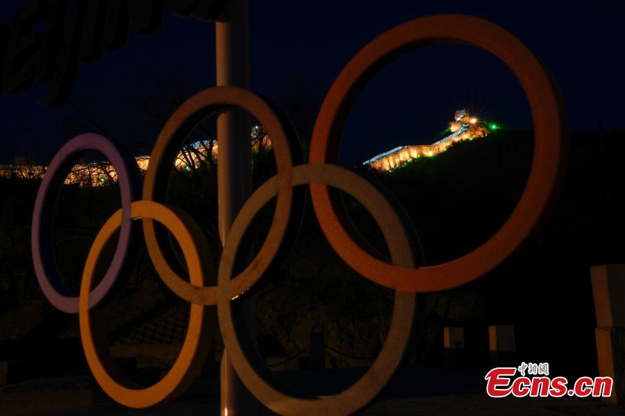 Logos of Beijing 2022 Winter Olympics on the foot of the illuminated Badaling Section of the Great Wall in Beijing, Feb. 8, 2022. (Photo/Agencies)
