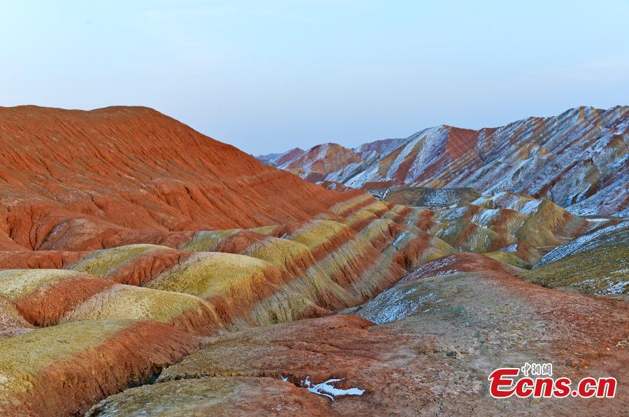 Danxia mountains in Zhangye city are known for rainbow-like colors. The white snow endues the spectacular landform a special charm in the vast northwest region.