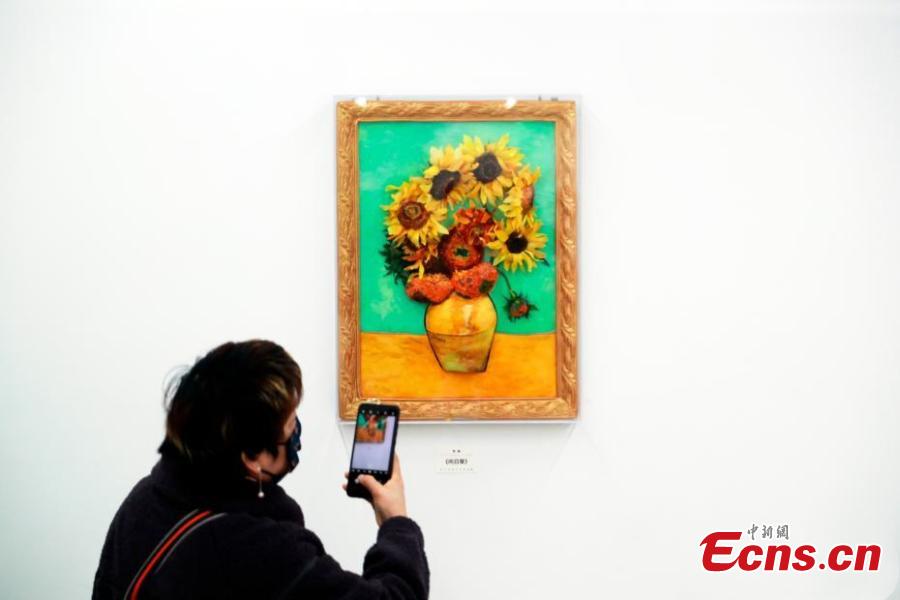 A visitor takes photo of the chocolate version of the Dutch painter Vincent van Gogh's classic Sunflowers in a newly-opened chocolate art museum in Shanghai, Feb. 10, 2022. (Photo provided by Tang Yanjun)