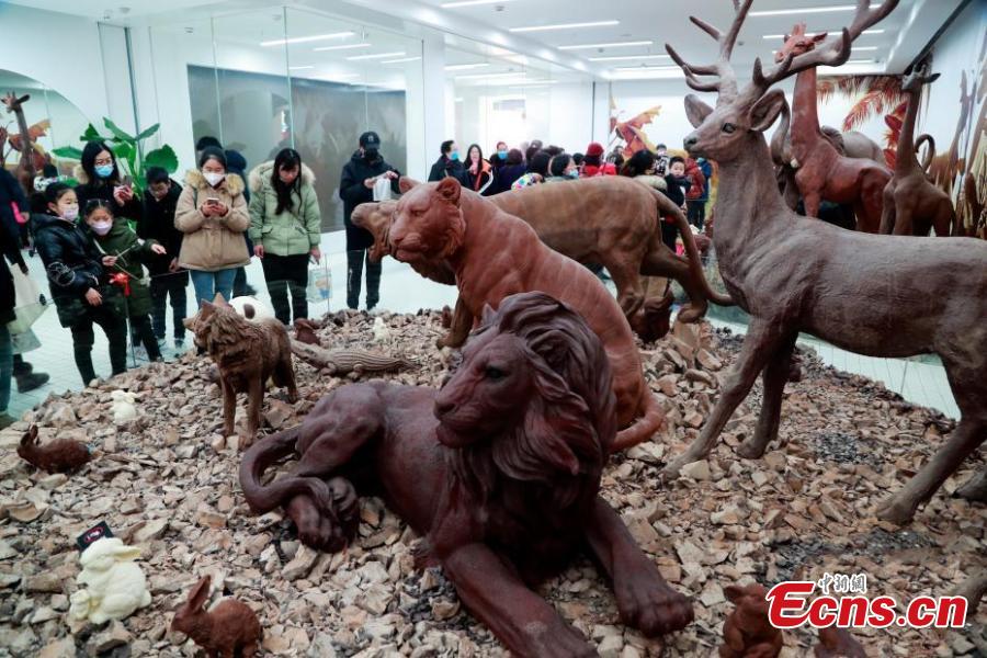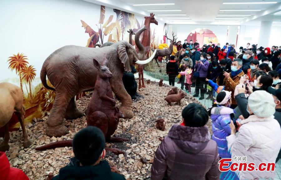 Chocolate-made animal exhibits attract a lot of visitors at a newly-opened chocolate art museum in Shanghai, Feb. 10, 2022. (Photo provided by Tang Yanjun)