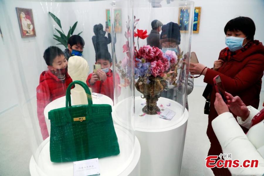 A chocolate bag and bouquet at a newly-opened chocolate art museum in Shanghai, Feb. 10, 2022. (Photo provided by Tang Yanjun)