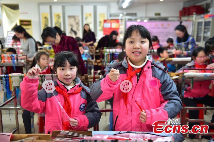 Craftsmen teaches pupils to stitch Beijing 2022 Winter Olympics mascot Bing Dwen Dwen with traditional Yuzhang embroidery at Nanchang, east China's Jiangxi Province, Feb. 9, 2022. (Photo provided by Yu Yunliang)
