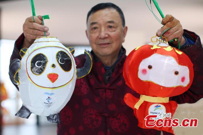 A craftsman shows two Qinhuai Lantern work in the shape of Beijing Olympics and Paralympics mascots Bing Dwen Dwen and Shuey Rhon Rhon at Nanjing, east China's Jiangsu Province. (Photo provided by Yang Bo)