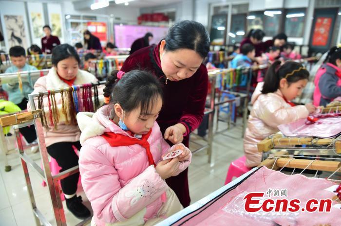 A craftsman teaches pupils to stitch Beijing 2022 Winter Olympics mascot Bing Dwen Dwen with traditional Yuzhang embroidery at Nanchang, east China's Jiangxi Province, Feb. 9, 2022. (Photo provided by Yu Yunliang)