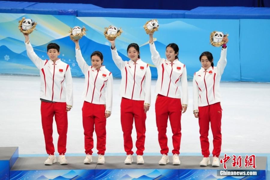Team China poses for photos during the flower ceremony after finishing third in the women's 3000m relay of short track speed skating at Capital Indoor Stadium in Beijing, capital of China, Feb. 13, 2022. (Photo: China News Service/Mao Jianjun)