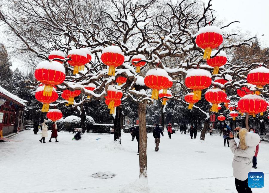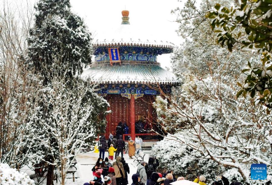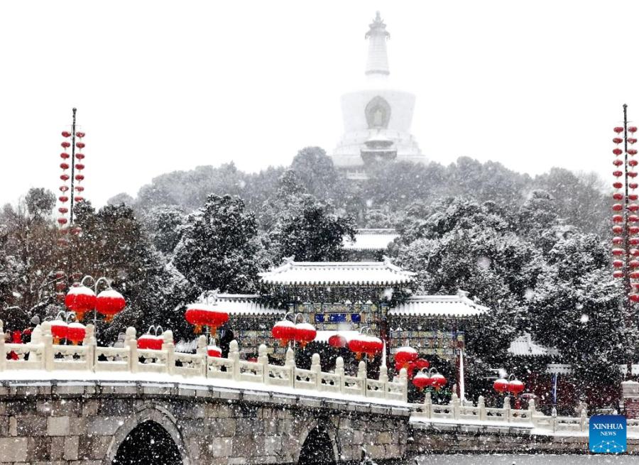 People enjoy the snow view at Beihai Park in Beijing, capital of China, Feb. 13, 2022. A snowfall hit Beijing on Sunday. (Xinhua/Song Weiwei)
