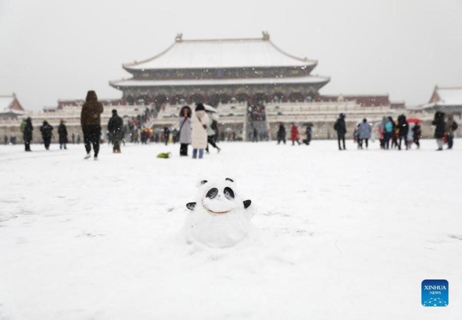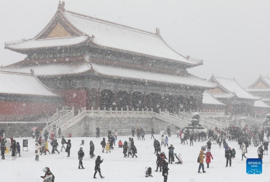 People enjoy the snow view at the Palace Museum, also known as the Forbidden City, in Beijing, capital of China, Feb. 13, 2022. A snowfall hit Beijing on Sunday. (Xinhua/Jin Liwang)