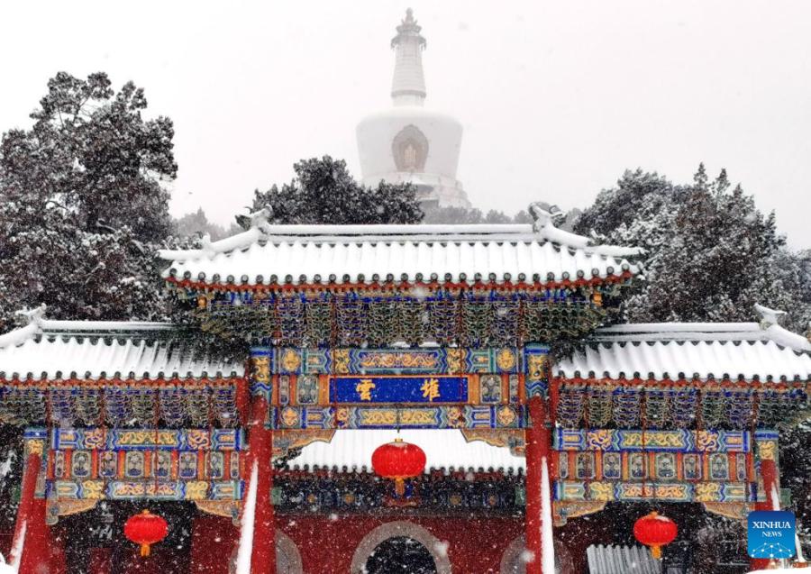 Photo taken with a mobile phone on Feb. 13, 2022 shows a snow view of Beihai Park in Beijing, capital of China. A snowfall hit Beijing on Sunday. (Xinhua/Pan Xu)