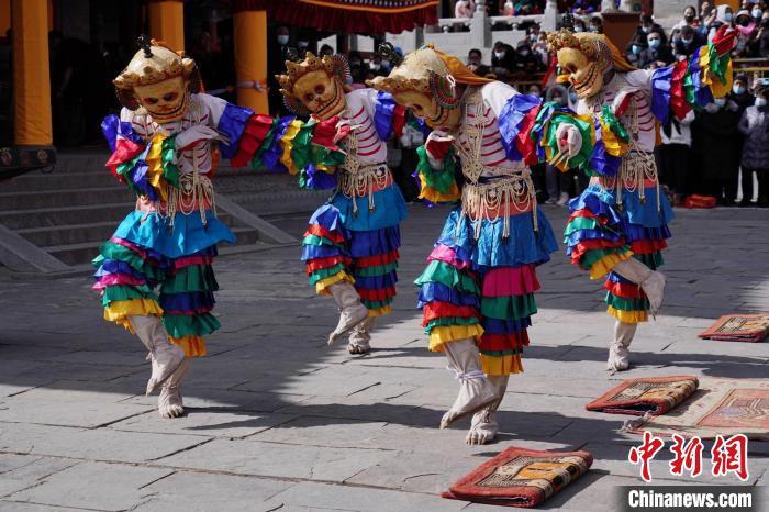 Monks perform "Tiaoqian", a masked religious dance with a history of over 300 years, at the Kumbum Monastery in Huangzhong County, northwest China's Qinghai Province, Feb. 14, 2022. (Photo/Ma MIngyan)